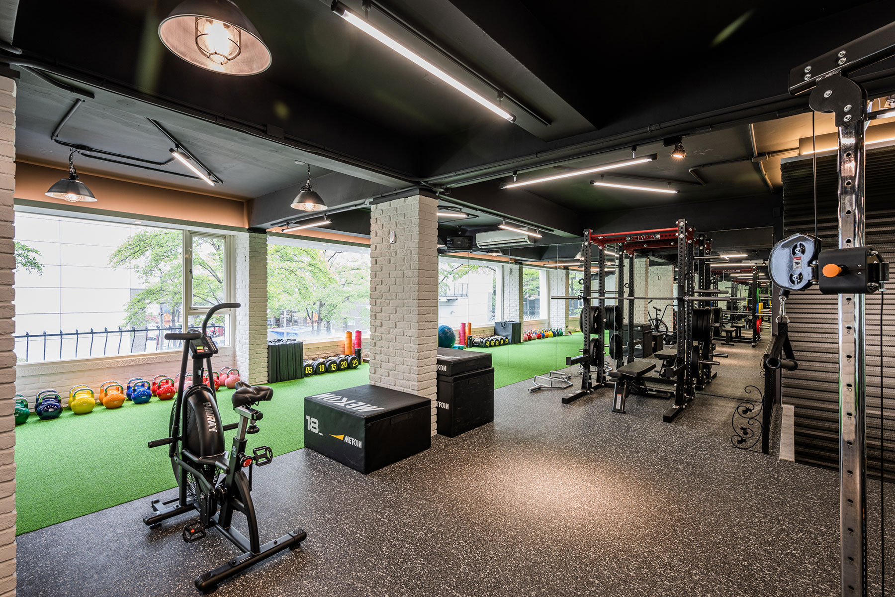 色調以黑白灰為主,卻又相當強調空間立體感,把 #輕工業 風格於其中發揮得淋漓盡致,簡單大方不複雜。一二樓空間以課程配置及器材功能不同做出區隔,健身房運動的寬敞大空間也能充分利用每一坪。