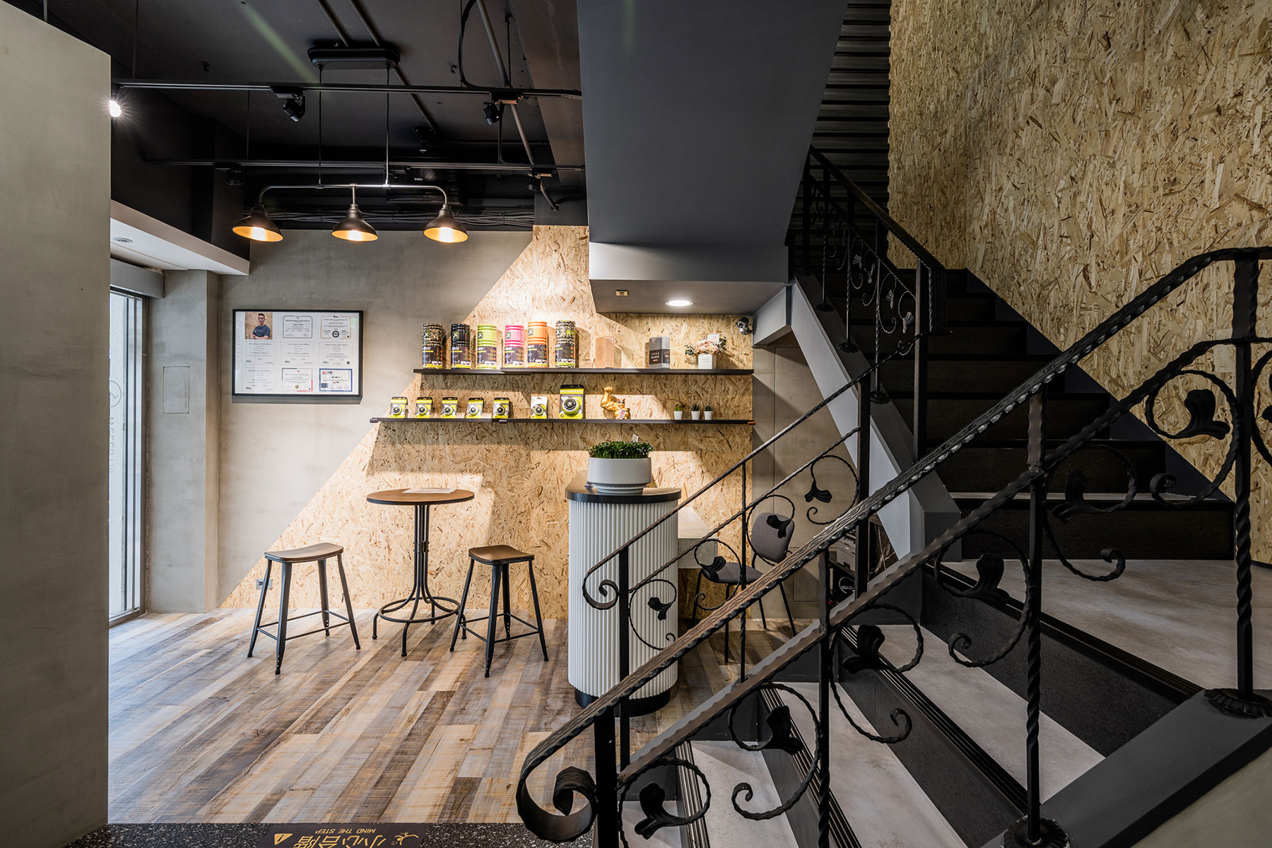 我們想把這種追求卓越的精神體現在空間中,於是將管線裸露的挑高樓板刷上黑色底漆,讓空間通透性及大面玻璃窗採光,不被多餘色彩干擾,凸顯建材本身的質感。牆面選用OSB板,搭配線條簡練的五金配件,粗獷中帶有細節。