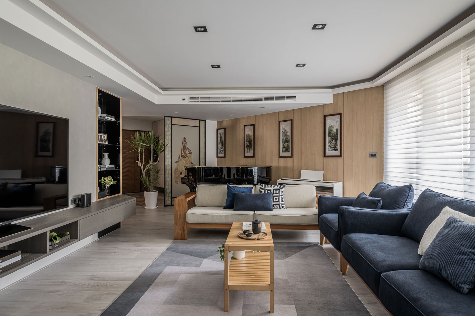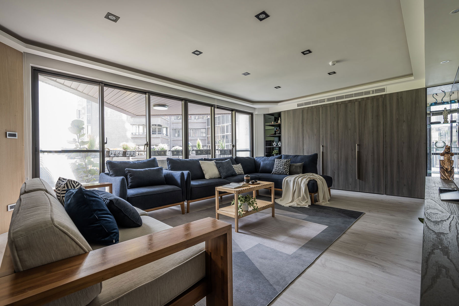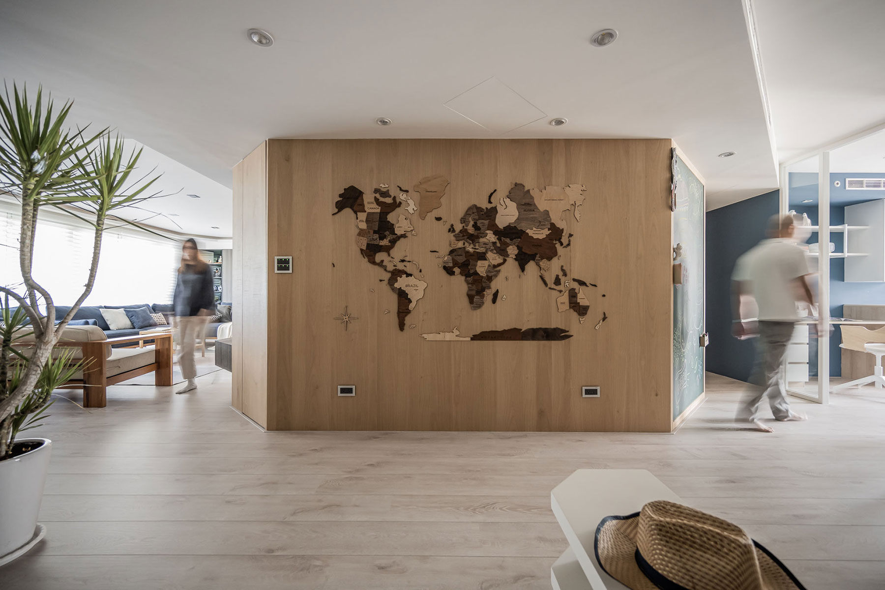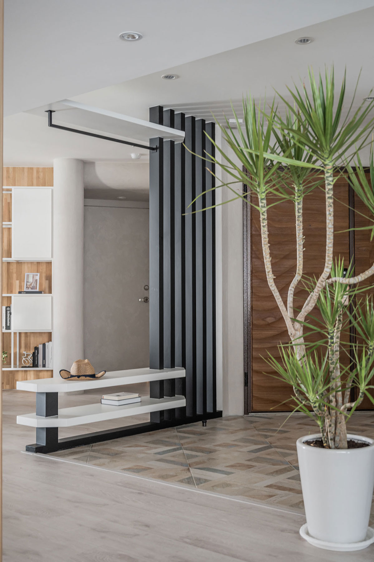 讓信仰融入現代家居空間是一門課題,如何符合祭拜禮俗,又不因傳統元素顯得風格衝突,考驗設計師功力。客廳牆面鋪設較沈穩明亮的淺木紋,讓玄關處的觀音重繪屏風及業主私藏的多幅山水畫都能恰如其分地融合;而隱藏式神桌設計,將神桌安排在推拉門隔間,充分利用零碎空間,更是解決了視覺紊亂的挑戰,可說是神來一筆。