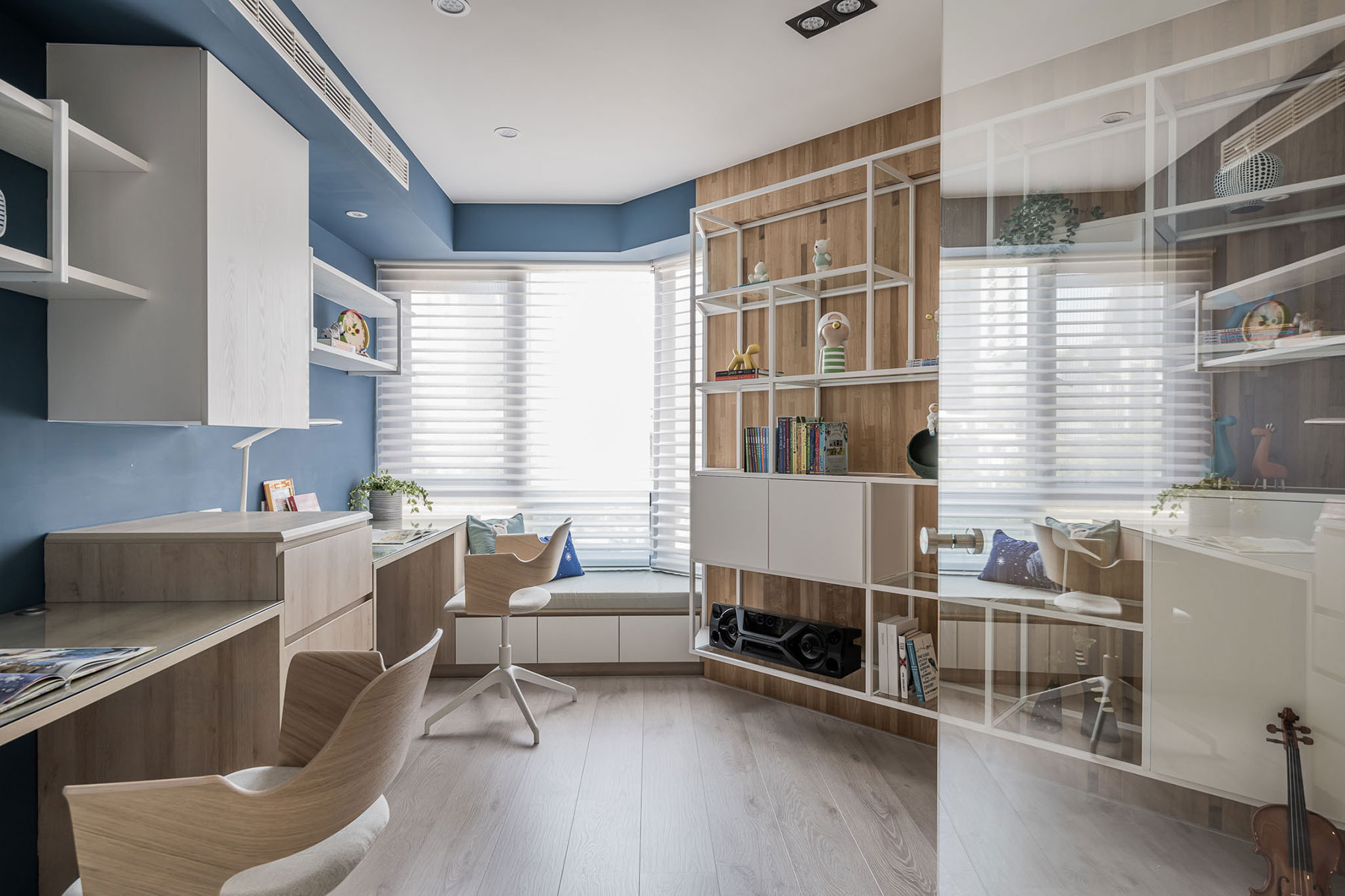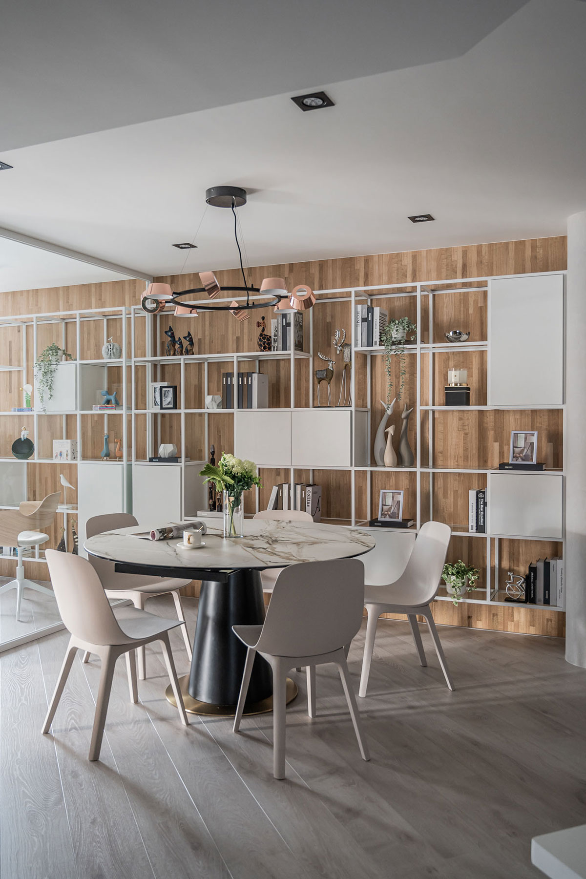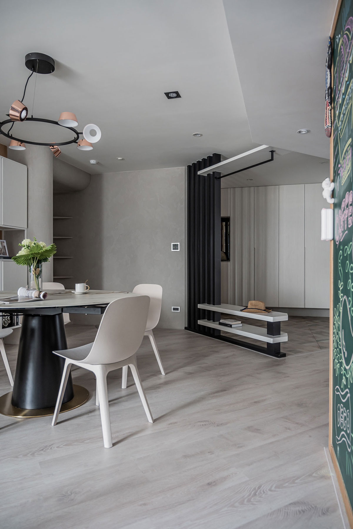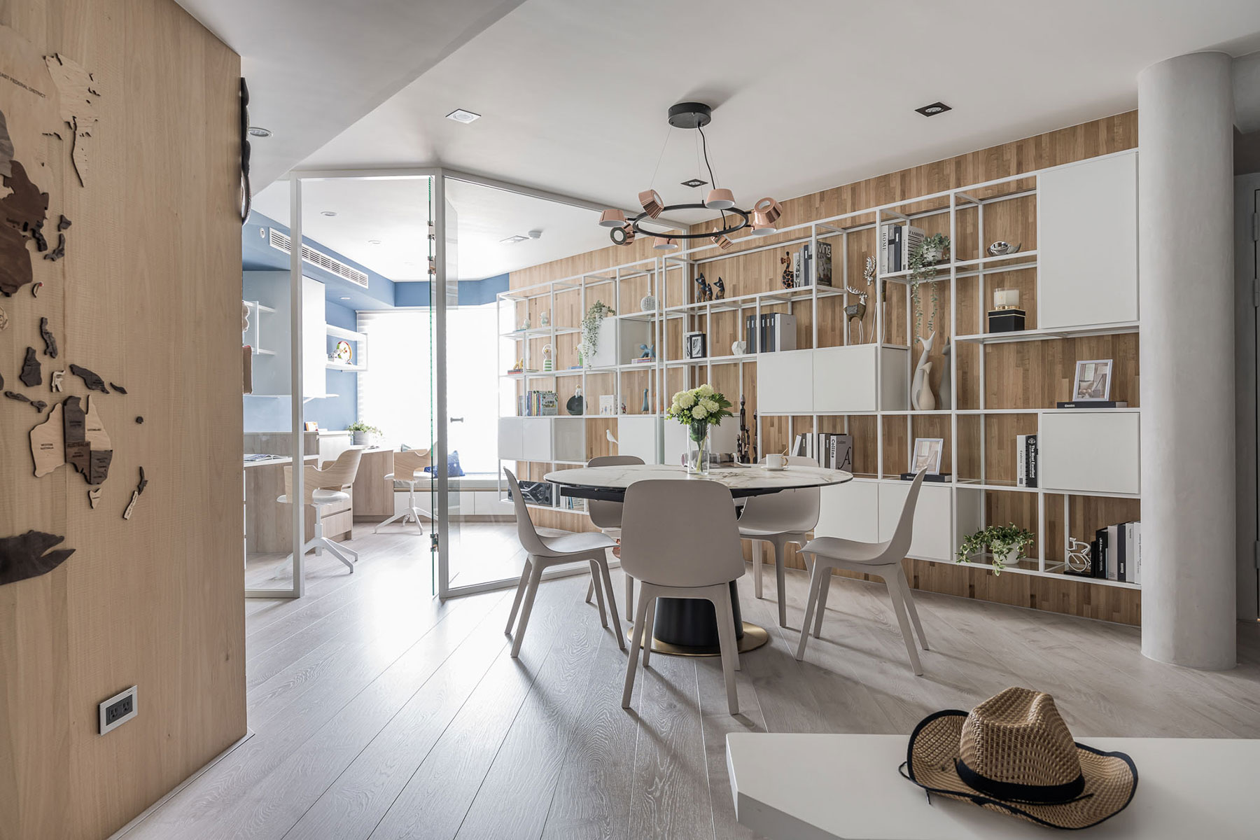 受限於八卦型格局,設計師利用四周採光充足的優勢,將書房與餐廳以玻璃隔間,改善暗區。同時,於背牆設計大面的鐵件格造型櫃,屋主能展示收藏品,延伸進書房也給孩子們做書櫃使用。牆面局部搭配特殊塗料,隱藏門設計營造洗鍊簡約的視覺感,也更讓人好奇每扇門後令人驚艷的不同風貌。