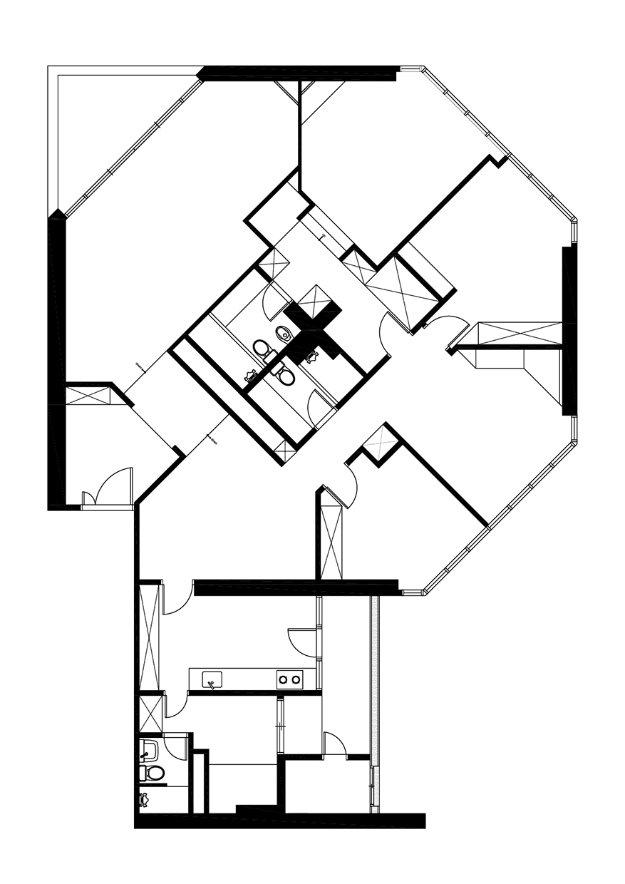 拓寬廚房及新增中島,使用L型大廚具以及雙水槽,重新規劃動線,讓料理更流暢。並顧及節慶時可能的招待或聚餐需求,仍保留能容納十人座的圓桌作為飯廳使用。