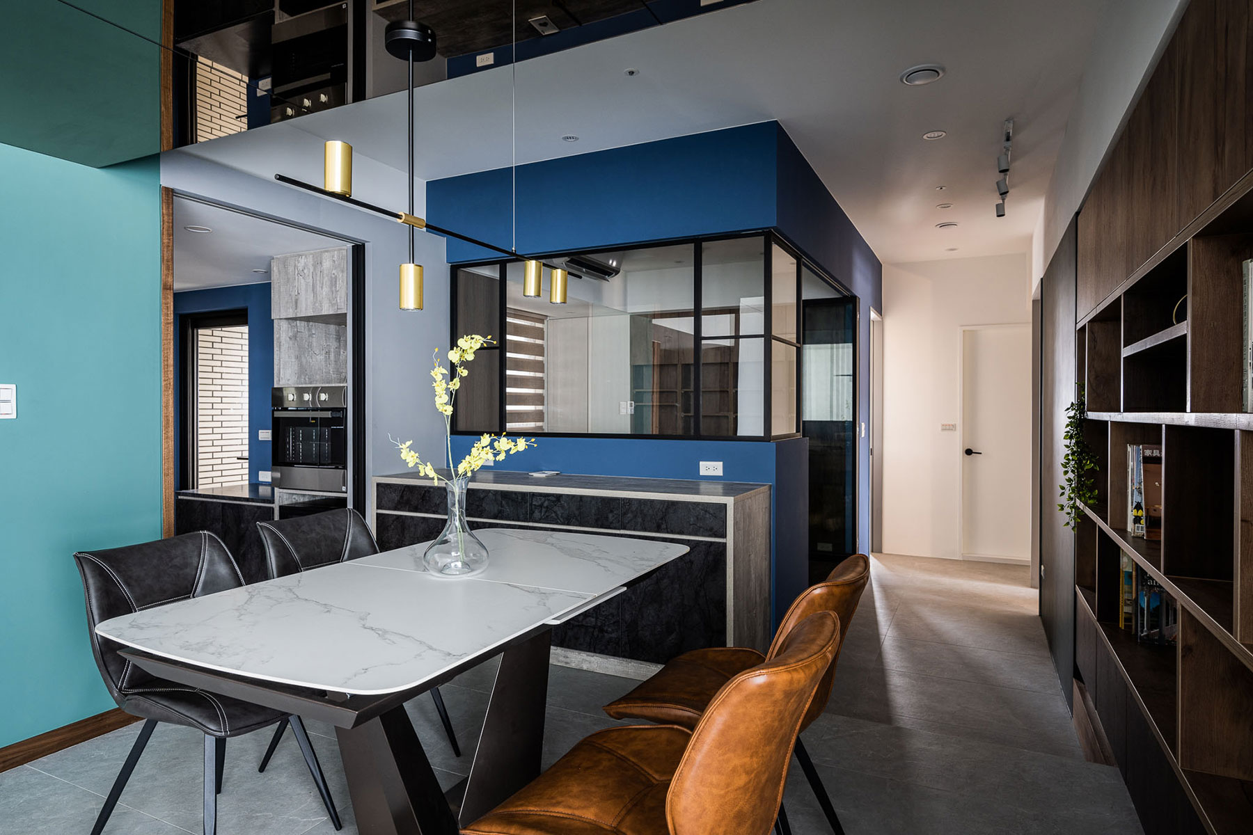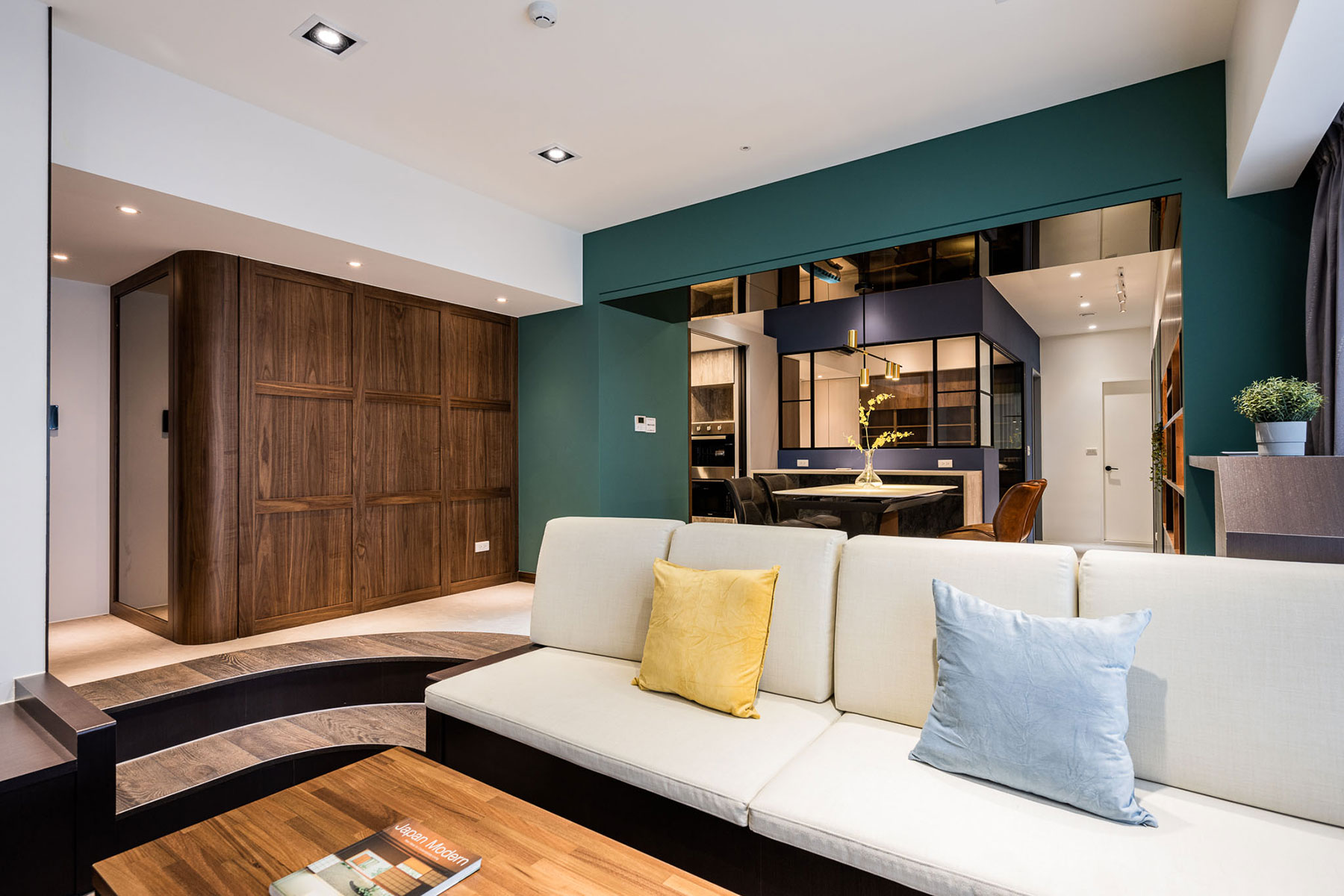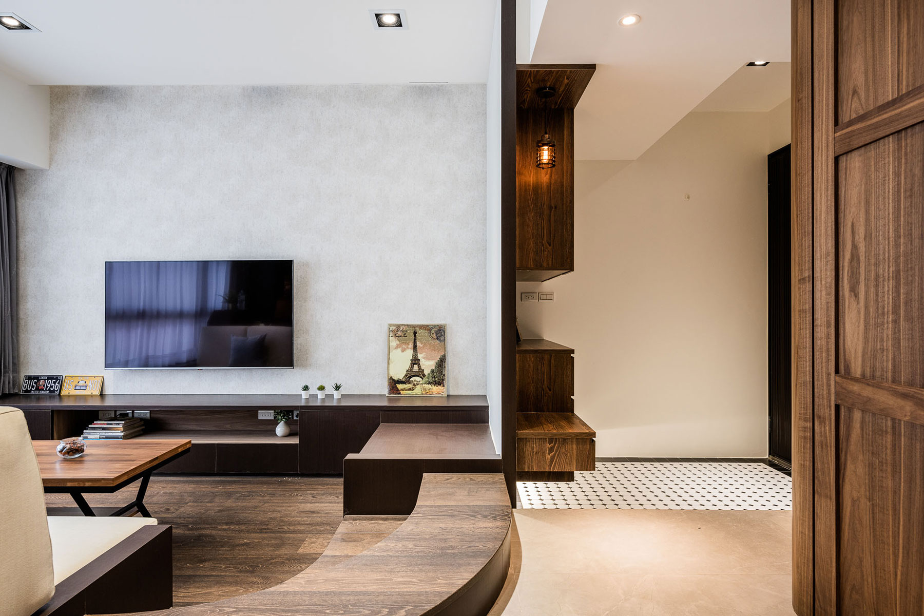 鋼刷實木貼皮、黑白馬賽克滾邊磚、金屬烤漆屏風、大板岩磚、超耐磨木地板、黑色鋁框格屏、進口手工窯變磚(綠)